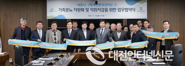 세종특별자치시(시장 이춘희)가 가축 분뇨의 악취 감소 등 깨끗한 축산 환경을 위해 10일 시청 집현실(본관 5층)에서 축산환경관리원과 업무협약을 맺었다.