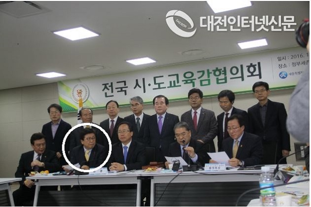 지난 24일 세종특별자치시 정부세종컨벤션센터 1층 비즈니스센터에서 17개 전국시도교육감 협의회가 대구, 경북이 불참한 가운데 개최되어 역사교과서 국정화 반대와 폐기를 요구하는 성명을 채택하고 발표할 당시 모습 (원안) 최교진 교육감.