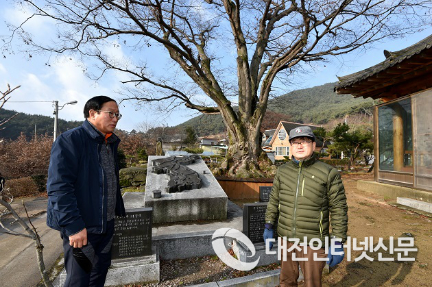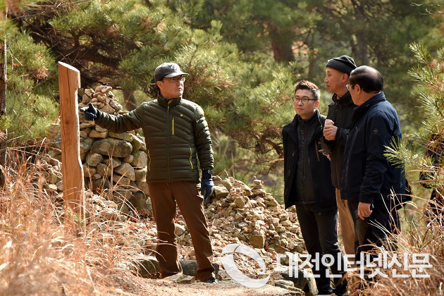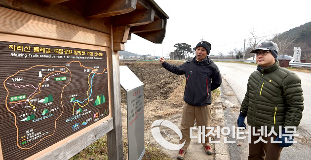 신원섭 산림청장(오른쪽)은 9일 전북 남원시 주천면 지리산둘레길을 찾아 관계자들과 안내판, 이정표, 훼손지 등을 점검했다. <사진=산림청 제공>