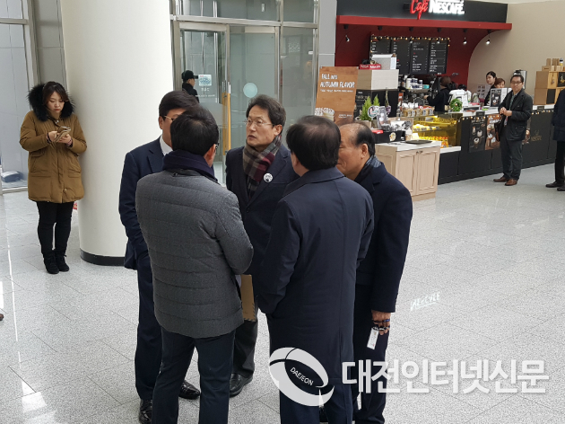 ▲ 현직교육감들의 교육부 방문이 제지당하자 망연자실하며 대책을 논의하는 교육감들의 얼굴이 상기되어있다.