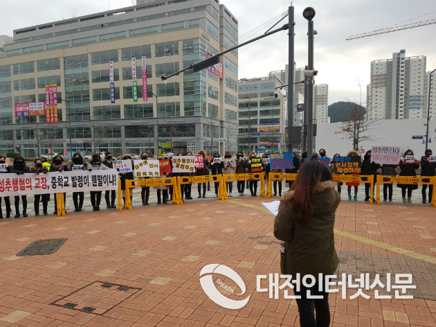 세종시 A고교 성추행 파문의 중심에선 B교장의 C중학교 전근발령에 항의하는 C중학 학부모회와 비상대책위원회원 100여명이 13일 오후13시 징계위원회가 열리는 세종교육청 앞에서 교장발령 철회, 현 교장 6개월간 겸직 요구, 신임교장 발령시 사전협의 요청, 발령에 관한 정정보도를 요구 하였다.