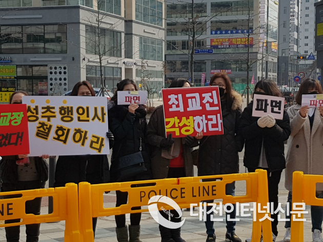 이날 C중학교 학부모들의 항의 집회에 앞서 참교육을위한전국학부모회 세종지부(지부장 윤영상)회원 10여명이 기습시위를 갖고 성추행 파문 교장을 즉각 파면하고 인사 최고 책임자인 최교진 세종교육감의 사과를 요구하는 시위를 하였다.