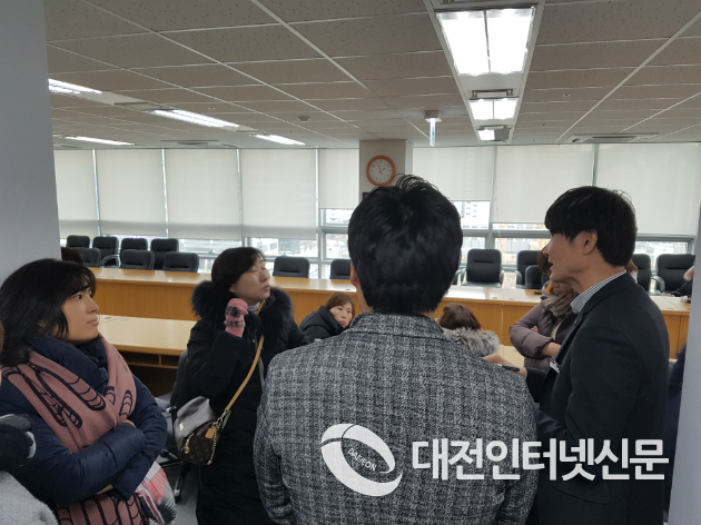 징계위원회가 열리는 회의실에 조금이라도 가깝게 접근하려는 학부모들을 제지하려는 교육청 직원들간 설전이 이어지고 있다.