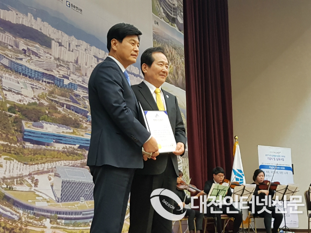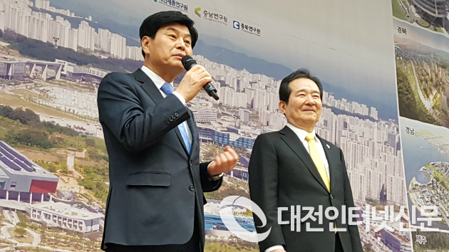 14일부로 세종시민이된 정세균 국회의장과 이춘희 세종시장이 환영사와 소감을 설명하고 있는 모습.