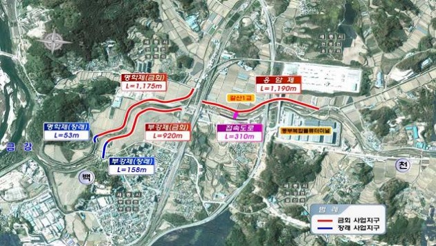 금천지방하천, 위치는 세종특별자치시 금남면 감성리 ~ 금천리 일원이며고사업량은 축제 및 호안정비 L=3.05km 교량 2개소, 보 6개소이며 총사업비는 14,497백만원〔공사비 7,106, 보상비 등 7,391〕공사기간은 `14. 7. 15. ~ `17. 7. 13. 이다.