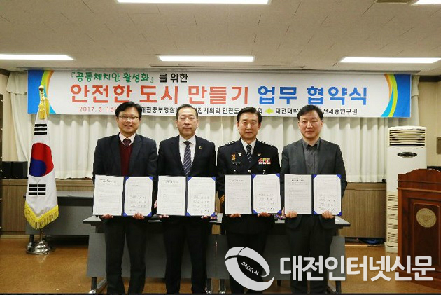 대전중부경찰서 생활안전계(계장 홍재구)는 지난 16일 중부서 소회의실에서 범죄예방을 위한 도시환경설계에 뜻을 모아 중부경찰서대전시 의회 안전도시연구회-대전대학교-대전세종연구원 간 업무협약을 체결했다.