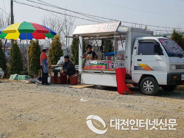▲ 차량이 통행하면 먼지가 발생하는 곳에 위생은 전혀 개의치 않는 먹거리가 먼지속에 방치된 체 판매되고있는 현장.