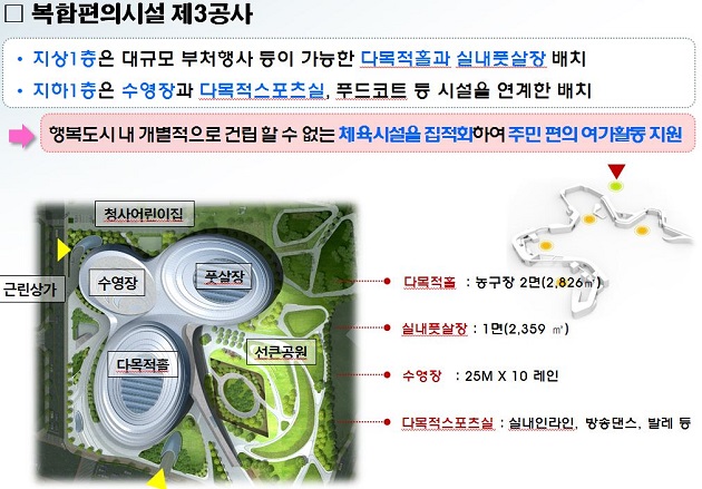 제3공사는 기획재정부․환경부 인근 주차장에 사업비 1105억 원, 연면적 3만7937㎡ 규모로 수영장․다목적홀․실내풋살장 등이 포함된 대규모 복합체육시설로 건립한다.