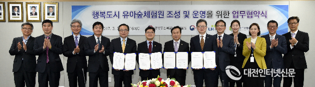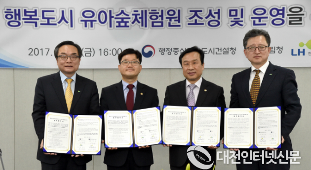 산림청(청장 신원섭)은 행정중심복합도시건설청(청장 이충재), 한국산림복지진흥원(원장 윤영균), 한국토지주택공사(사장 박상우)와 31일 오후 4시 행복도시건설청 종합상황실에서 `행복도시 유아숲체험원 조성 및 운영 활성화를 위한 업무협약´을 체결했다고 밝혔다.