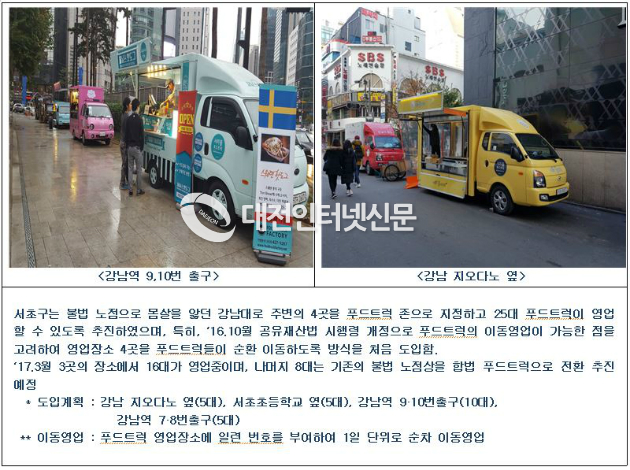 서초구는 푸드트럭으로 기존 노점상을 대체하면서 강남대로 주변 4곳을 푸드트럭 존으로 지정, 푸드트럭이 이동영업을 할 수 있도록 하는 `이동영업 시범사업´을 진행 중이다.