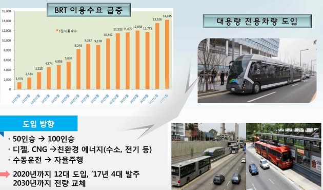 이충재 행복청장은 그동안 표류중이던 대용량 전용버스(바이모탈트램 등)구입에 대하여 어떤 루트를 통해서든 행복청이 책임지고 추진하겠다고 밝히면서 이를 위해 올해 4대를 발주하여 19년에는 세종시 BRT 도로를 씽씽달리는 대용량 전용버스를 볼 수 있도록하고 2020년까지 12대를 도입할 예정이라고 19일 정례브리핑을 통하여 밝혔다.