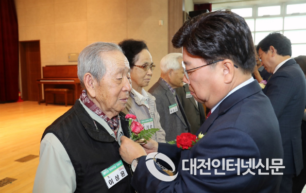 ▲ 권선택 대전장이 8일 대전광역시 노인복지관에서 대전시에 사는 장수어르신인 이상윤씨에게 카네이션 꽃을 달아 드리고 있다. 사진제공-대전시청