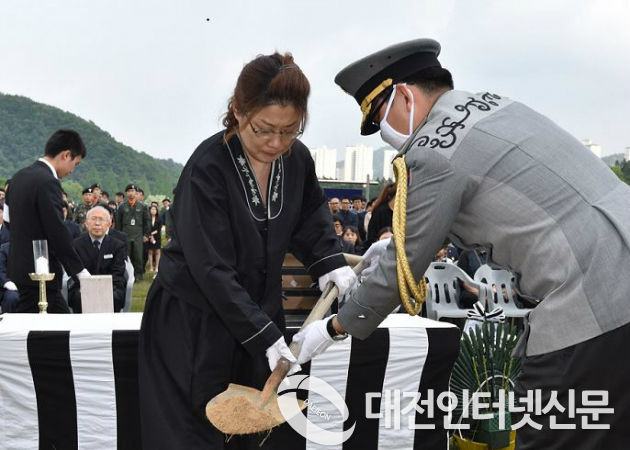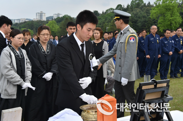 산림청이 산불 진화에 나섰다가 순직한 조병준 정비사에 대한 안장식을 10일 오후 국립대전현충원에서 거행한 가운데 유족들이 허토를 하고 있다. <사진=산림청 제공> |