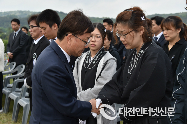 산림청이 산불 진화에 나섰다가 순직한 조병준 정비사에 대한 안장식을 10일 오후 국립대전현충원에서 거행한 가운데 신원섭 산림청장이 유족들을 위로하고 있다. <사진=산림청 제공> |