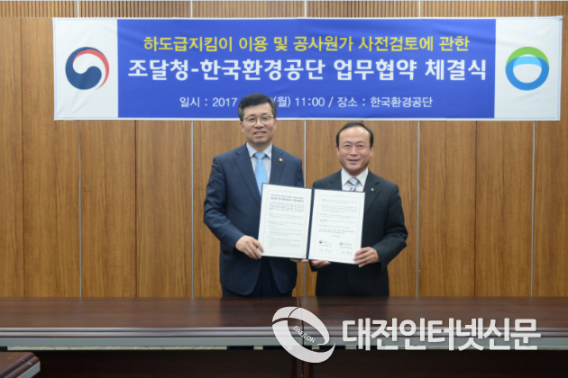 조달청(청장 정양호)과 한국환경공단(이사장 전병성)은 5월 15일(월) 11시 인천광역시 서구 소재 한국환경공단에서 하도급지킴이 이용 및 공사원가 사전검토에 관한 업무협약(MOU)을 체결했다.
