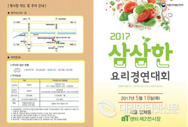 식품의약품안전처(처장 손문기)는 나트륨을 줄여 짜지 않으며 맛도 좋은 요리 메뉴를 개발하고 보급하기 위해 `2017년 제6회 삼삼한 요리 경연대회´를 식품안전주간(5.7.~5.21.)과 연계하여 5월 18일 aT센터(서울 서초구 소재)에서 개최한다고 밝혔다.