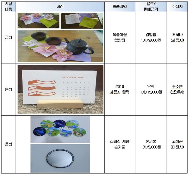 이번 공모전에서는 금상에 선정된 `복숭아꽃 컵받침´ 외에 `2018 세종시 달력´과 `스페셜 세종 손거울´이 각각 은상과 동상을 수상했다.