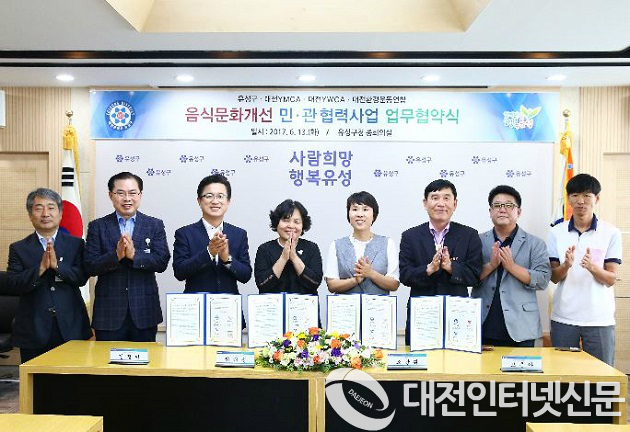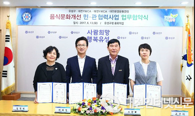 대전 유성구(구청장 허태정)는 13일 구청 중회의실에서 대전YMCA 및 대전환경운동연합, 대전YWCA 관계자 10여명이 참석한 가운데 음식문화개선 민·관 협력 사업을 위한 업무협약을 체결했다고 밝혔다.