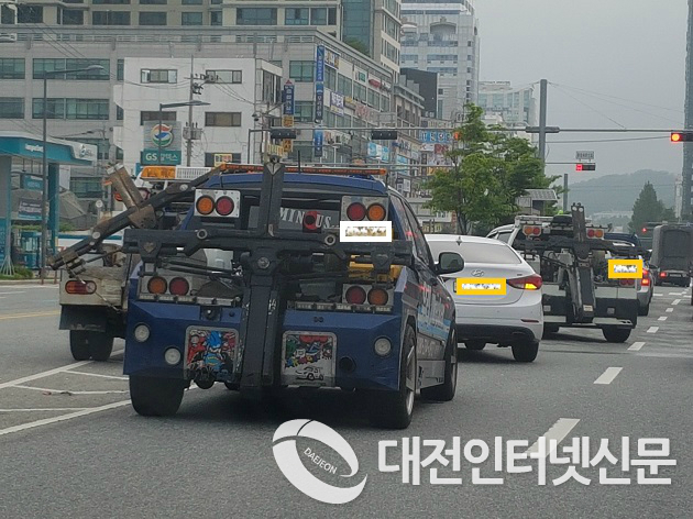 견인차량들의 무질서가 2차사고의 위험을 조장하고 있는 모습. [사진-대전인터넷신문]