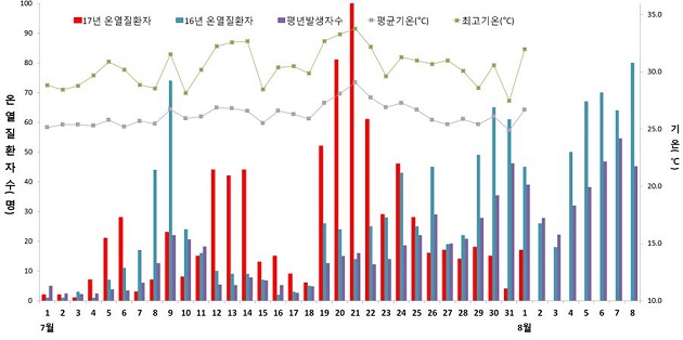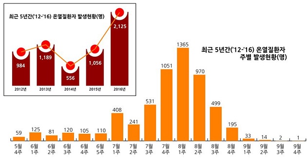 질병관리본부 분석에 따르면 지난 5년간(2012-2016) 온열질환자 5,910명중 폭염일수(폭염일수 : 일 최고기온 33℃이상인 날의 일수)가 증가하는 8월 1주에서 2주사이 환자가 전체의 39.5%로 가장 많았으며, 2017년 신고(5월 29일~ 8월 1일) 온열질환자는 919명(사망 5명)으로, 5년간 가장 온열환자가 많았던 전년 동 기간 대비 약 7% 증가하였다.