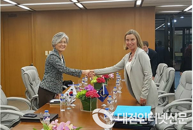 강경화 외교부 장관은 ASEAN 관련 외교장관회의 참석 계기에 8.6(일) 19:15-19:50간 「페데리카 모게리니(Federica Mogherini)」 유럽연합(EU) 외교안보 고위대표와 △ 한-EU 양자 관계 발전 △ 한반도 정세 및 북핵문제 공조 방안 등에 대해 협의를 가졌다.