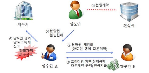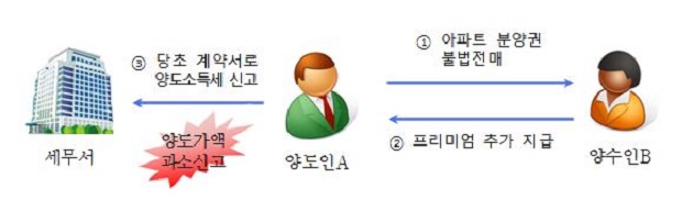 [사례3] ´16.4. 양수인 A는 아파트 분양권을 전매 제한기간 중 취득하였으며 양도인에게 프리미엄 00백만 원을 지급하고 계약금을 대납하였으며 양수인 A는 ´16.10. 양수인 B에게 아파트 분양권을 00백만 원에 재차 양도하였으나 프리미엄을 00백만 원으로 축소하고 양도인이 양수인 B에게 양도한 것처럼 허위계약서를 작성하고 양수인 A는 계약서에 기재된 프리미엄은 계좌이체로 수령하고 실제 프리미엄과의 차액은 현금으로 수령한 혐의.<양도소득세 00백만 원을 추징하고 지자체에 불법 전매 및 부동산거래신고 위반자료 통보>