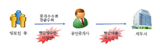[사례4] ○○○○은 ´12~´16년 강남4구 소재 아파트 단지 내 상가에서 부동산중개업을 영위하면서 중개수수료를 현금이나 차명계좌로 받아 수입금액을 과소신고하는 수법으로 수입금액 탈루, 특히, 부동산 거래신고 의무가 없는 전‧월세 중개수수료에 대해서는 현금이나 종업원 계좌로 수취하여 대부분 신고누락, 부동산중개업의 경우 현금영수증 의무발행업종이나 현금영수증 미발급 혐의.<부가세, 소득세 및 현금영수증 과태료 00백만 원 추징하고 지자체에 계약서 보관의무 위반 등 공인중개사법 위반 자료 통보>