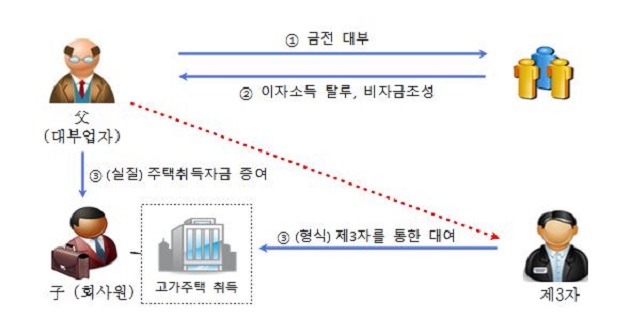 [사례6] 대부업자 A는 ´12~´16년 유흥업 종사원을 상대로 고리의 사채를 빌려주고 발생한 이자소득에 대하여 소득세를 탈루하고 이후 A는 탈루소득으로 조성한 비자금을 제3자를 통한 대여로 가장하여 아들 B의 고가주택 취득자금을 편법 증여한 혐의. <이자소득세 및 고가주택 취득자금 관련 증여세 00억 원 추징>
