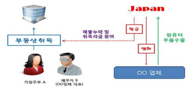 [사례7] 가정주부 A는 별다른 소득원이 없음에도 ´14~´16년 사이 다수의 부동산을 취득하여 보유 중, ´17.1. 조사결과 A는 컴퓨터 부품업체 대표인 배우자 B로부터 부동산 취득자금을 증여받은 것으로 확인, 한편, B는 일본에 부품을 수출하고 수출대금을 현지에서 현금으로 수령하는 방법으로 매출 누락하여 법인세 및 소득세 탈루한 혐의. <부동산 취득자금 관련 증여세 00억 원과 매출누락에 따른 법인세 및 소득세 00억 원 추징>