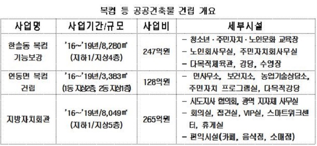 복컴은 주민 삶의 질 향상을 위해 신도시를 비롯해 읍면지역까지 지속적으로 확대 건립하고 있으며, 한솔동 복컴 기능보강과 연동면 복컴 건립이 순조롭게 추진돼 착공을 앞두고 있다.