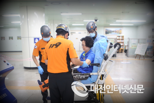 | ▲ 24일 현충원역에서 실시한 지하철 테러대비 민관군 합동 비상대응 훈련에서 119 구급대원이 부상 고객을 호송하고 있다.사진제공-대전도시철도공사