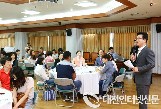 ▲28일 유성구가 주민참여예산제 일환으로 운영하고 있는 `누구나 구청장´ 공모사업의 우선순위 결정을 위한 구민회의를 개최한 가운데 허태정 유성구청장이 주민참여의 중요성을 강조하고 있다.