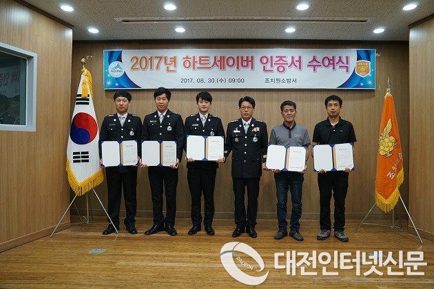 조치원소방서(서장 안종석)는 30일 장용두, 염재호, 김근주 소방교 등 119구급대원과 현병태(53), 김종인(51), 이동현(39)씨 등 일반인 3명에게 `하트세이버 인증서´를 수여했다.