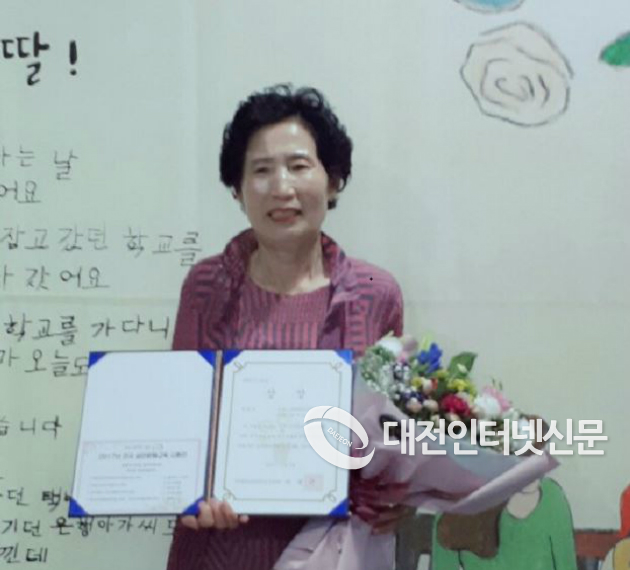 ▲ `대한민국 문해의 달´을 맞아 개최된 「2017년 전국 성인문해교육 시화전」에서 세종교육연구원 초등학력인정과정 성인문해교육 학습자 조인순(여, 76세) 어르신이 우수상(국가평생교육진흥원장상)을 수상했다. 사진은 우수상을 수상한 조인순 어르신(사진-세종시교육청)