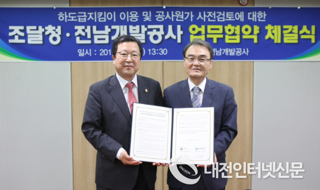 조달청(청장 박춘섭)은 9월 5일 전라남도 무안군 소재 전남개발공사에서 전남개발공사(사장 양지문)와 하도급지킴이 이용 및 공사원가 사전검토에 관한 업무협약(MOU)을 체결했다.
