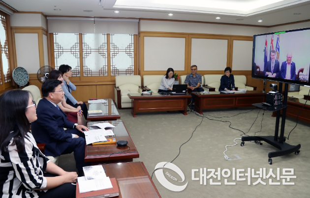 | ▲ 권선택대전시장과 쿼크 브리즈번시장이 화상회의을 하고 있다.사진제공-대전시청 |