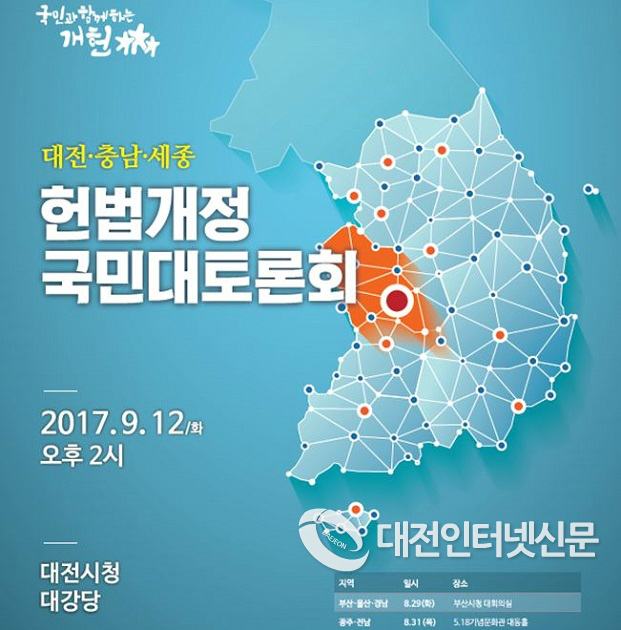 국회헌법개정특별위원회(위원장:이주영)와 대전광역시, 충청남도, 세종특별자치시가 공동으로 주최하는 헌법개정 국민대토론회가 9월 12일(화) 오후 2시에 대전시청 3층 대강당에서 개최된다.
