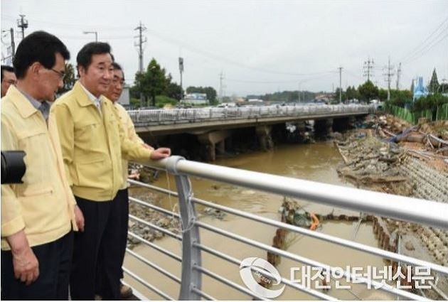 7월17일 이낙연 국무총리가 집중호우로 피해를 본 청주산단공공폐수처리시설을 점검하고 있다. [사진-국무조정실]