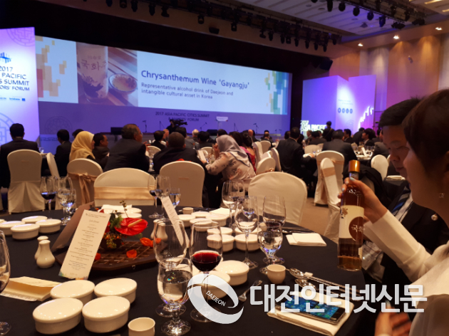 ▲ 아시아태평양 도시정상회의의 공식만찬주로 대전의 터줏대감 동춘당가의 가양주인 국화주가 소개되었다.사진-대전인터넷신문