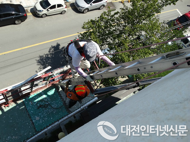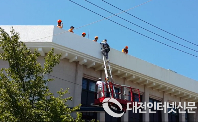 세종소방서 119특수구조단은 13일 건물 외벽 페인트 작업을 하던 고소 작업차량이 넘어지면서 차량에 고립된 작업자 2명을 안전하게 구조했다.