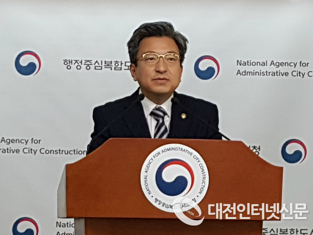 이원재 행복청장이 19일 정례브리핑을 통해 스마트시티건설과 복합편의시설 착공에 대하여 브리핑하고 있다. [사진-대전인터넷신문]