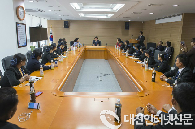 ▲ 세종시교육청은 지난 18일(월)부터 오는 28일(목)까지 10박 11일의 일정으로 미얀마 선도교원 21명을 세종시로 초청해 정보화연수를 실시한다고 19일(화) 밝혔다. 사진은 19일(화) 최교진 교육감과 미얀마 교원들의 면담 사진