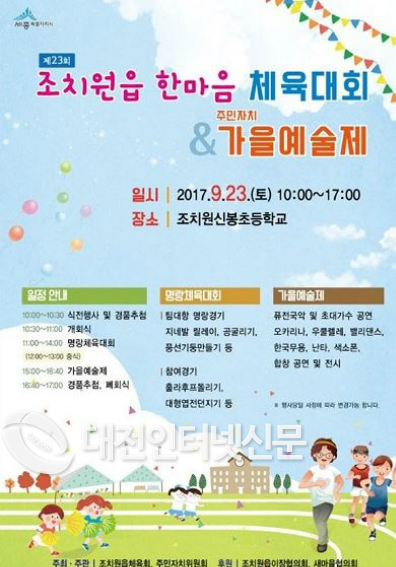 세종특별자치시 조치원읍체육회(회장 양완식)는 23일 조치원 신봉초등학교 운동장에서 읍민 2,000여명이 참여한 가운데 주민화합 한마당 체육행사를 개최한다.
