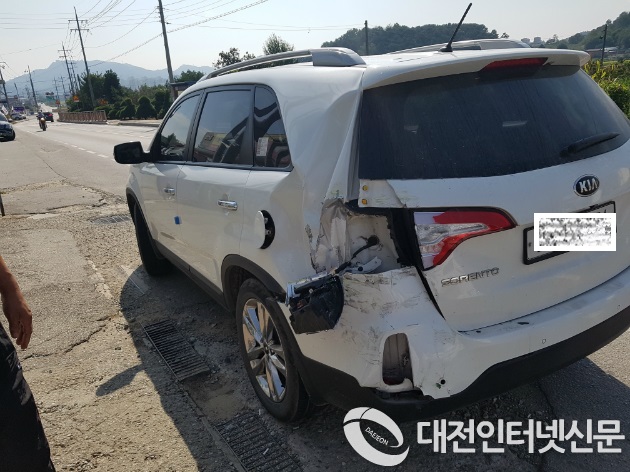 특별한 정비기준 없이 운행 중인 레미콘 트럭이 브레이크 고장으로 앞서가던 SUV차량을 추돌하고 주택가로 돌진하여 자칫 대형 인명사고가 .....[사진-대전인터넷신문]
