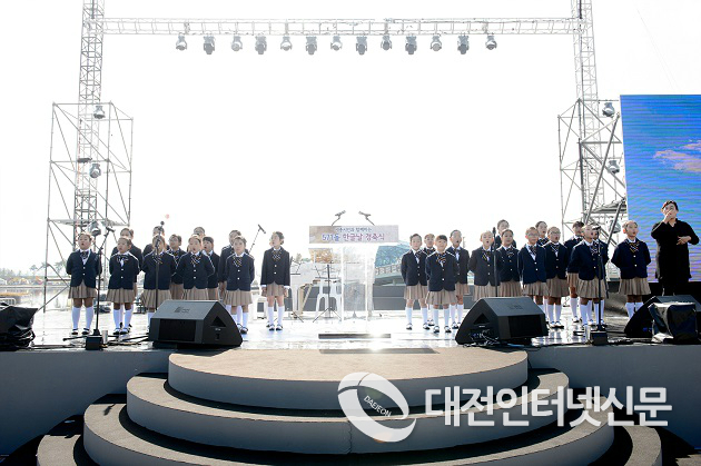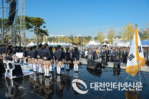 | ▲ 9일 한글 창제․반포 571돌을 맞아 세종호수공원 주무대에서 이춘희 시장과 고준일 세종시의회 의장을 비롯, 한글학회 회원과 시민, 학생 등 500여명이 참석한 가운데 한글날 경축식을 가졌다.(사진-세종시청) |