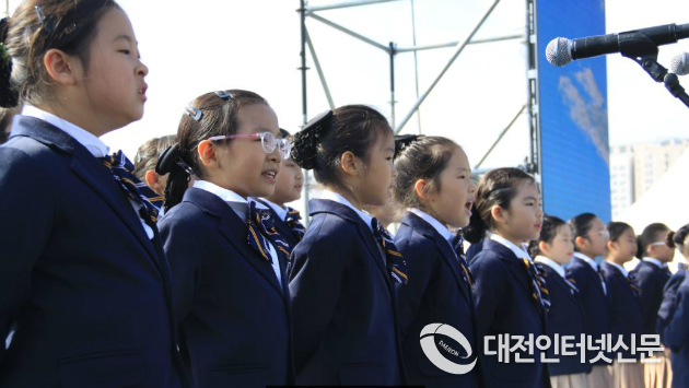 571돌 한글날 경축식이 열리는 호수공원 중앙무대에서 세종시 소년소녀합창단이 한글날 노래를 제창하고 있다. [사진-대전인터넷신문]