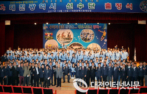 제98회 전국체육대회에 출전하는 대전선수단이 10월 13일 오후 4시 시청 대강당에서 출정식을 갖고 장도에 올랐다.