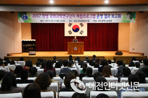 대전광역시교육청(교육감 설동호)은 10월 17일(화) 16:00, 교육과학연구원 대강당(2층)에서 참가학생, 학부모, 교사 등 300여명을 대상으로 2017 학생 국외과학연구단지 체험프로그램 운영 결과 보고회를 개최했다.