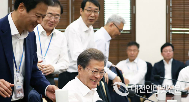 문재인 대통령이 23일 청와대에서 수석보좌관 회의를 주재하고 IMF와 한국은행이 올해 경제성장률 전망을 3.0%로 상향한 것과 사상최고의 종합주가지수를 보고받고 환하게 웃고잇다.[사진-청와대]