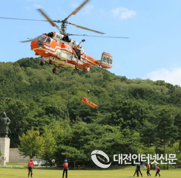 지상구조대는 산악사고 유형에 따라 응급처치를 하고, 산림항공구조대 헬기가 환자를 인양하여 병원으로 이송하는 훈련을 실시한다.